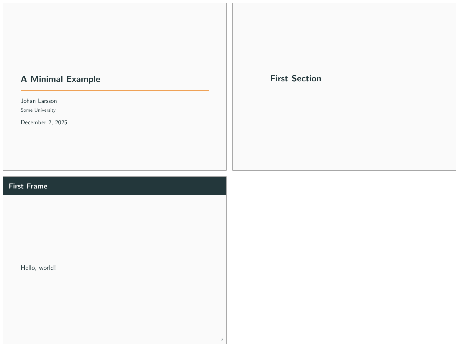 The following code shows a minimal example of a Beamer presentation using Moloch.